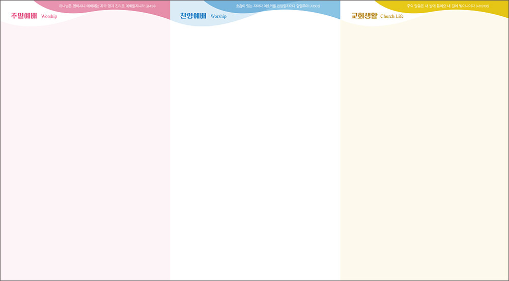 모든 디자인이 완료된 후 현재 교회가 사용중인 한글파일을 보내주시면, 새로운 주보에 맞추어 인쇄가 가능하도록 한글파일을 제작해드리고 있습니다. (한글작업 요청시 약 1-3일 정도의 시간이 소요되오니 참고해 주시기 바랍니다.)