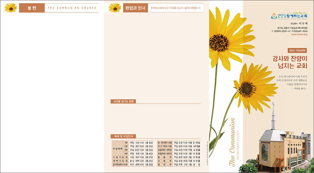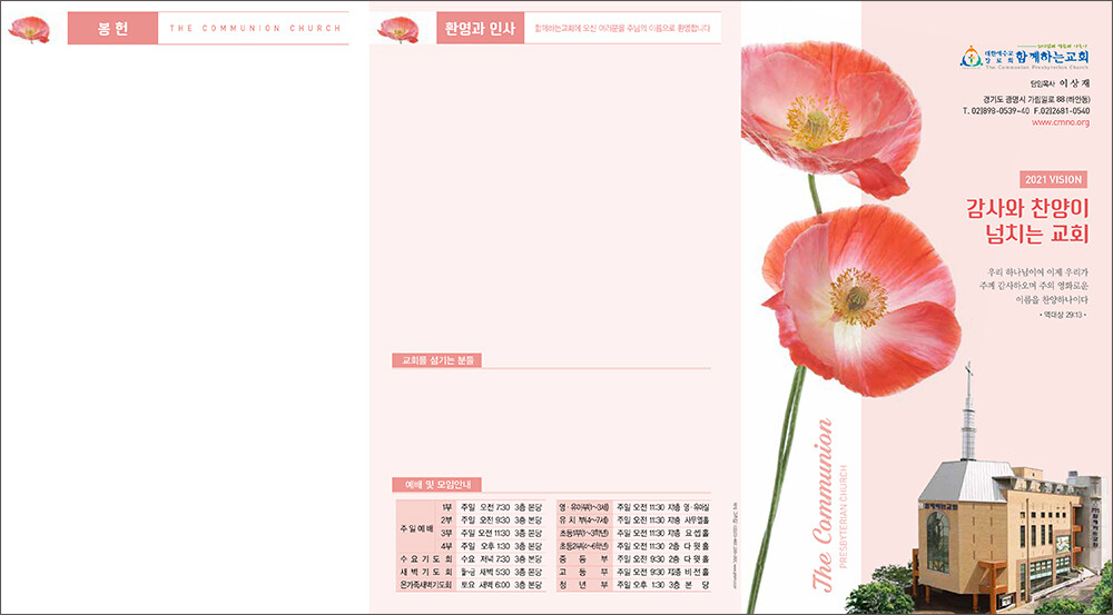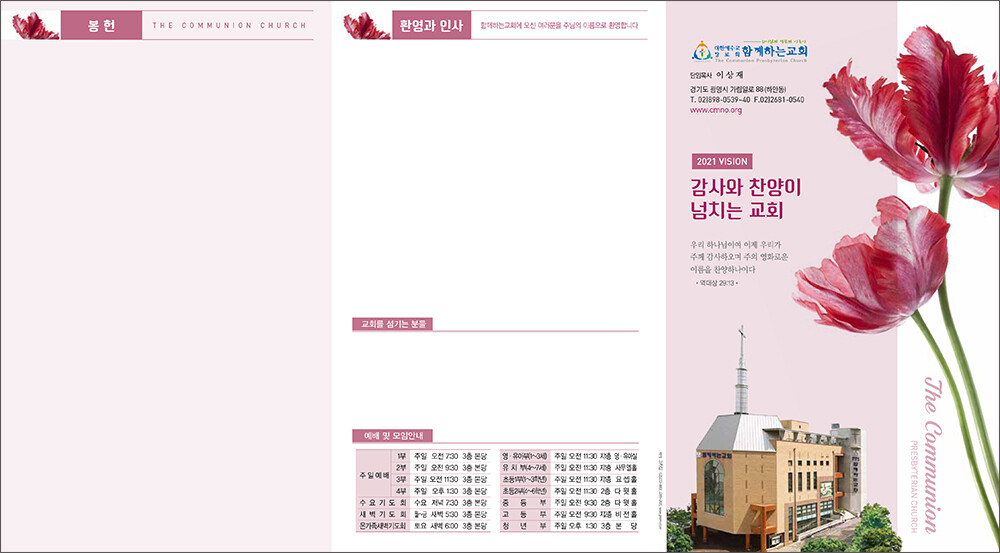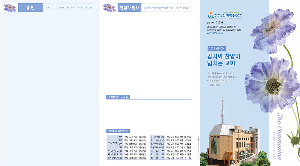 모든 디자인이 완료된 후 현재 교회가 사용중인 한글파일을 보내주시면, 새로운 주보에 맞추어 인쇄가 가능하도록 한글파일을 제작해드리고 있습니다. (한글작업 요청시 약 1-3일 정도의 시간이 소요되오니 참고해 주시기 바랍니다.)