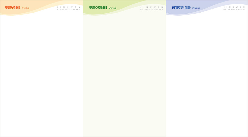 모든 디자인이 완료된 후 현재 교회가 사용중인 한글파일을 보내주시면, 새로운 주보에 맞추어 인쇄가 가능하도록 한글파일을 제작해드리고 있습니다. (한글작업 요청시 약 1-3일 정도의 시간이 소요되오니 참고해 주시기 바랍니다.)