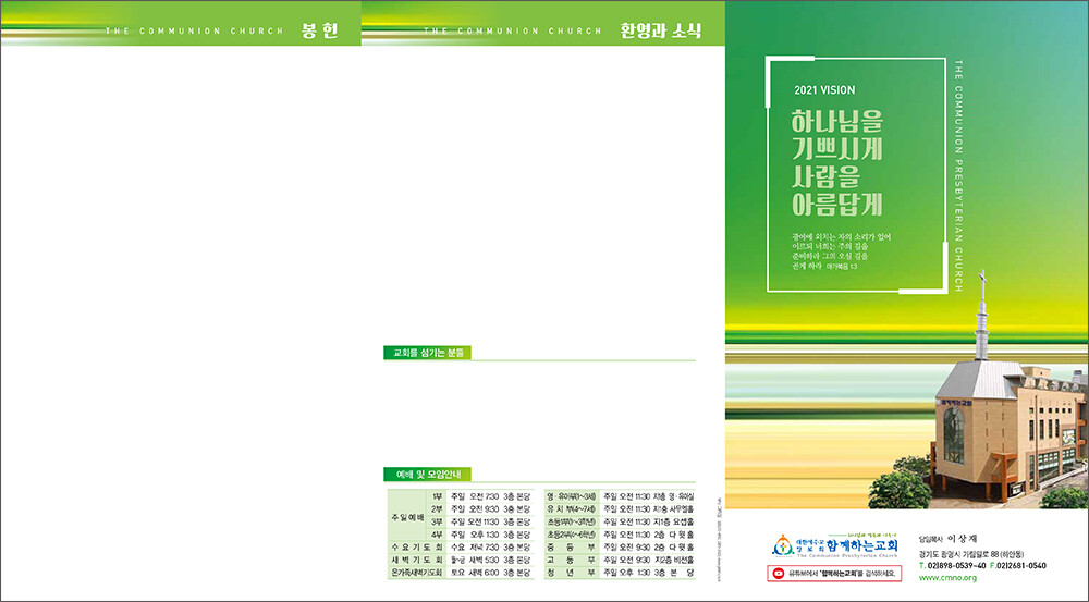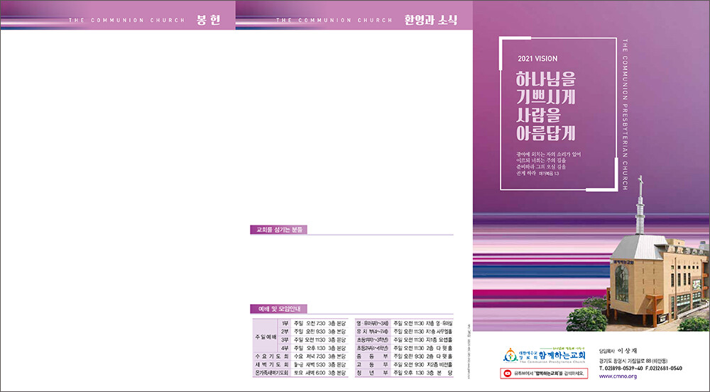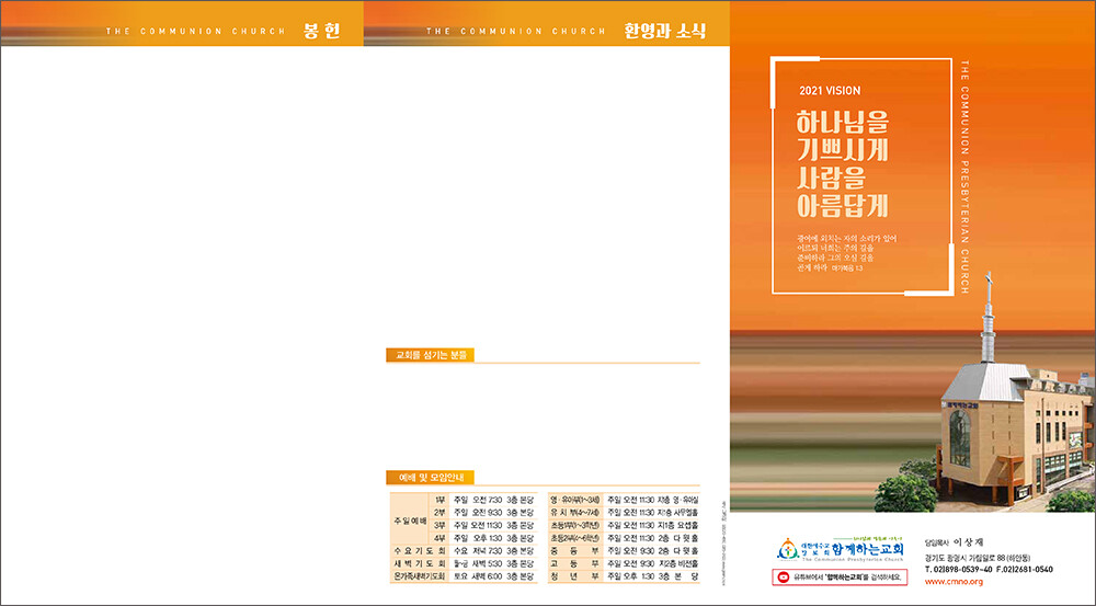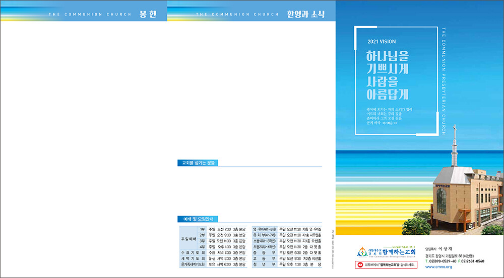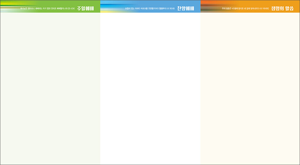 모든 디자인이 완료된 후 현재 교회가 사용중인 한글파일을 보내주시면, 새로운 주보에 맞추어 인쇄가 가능하도록 한글파일을 제작해드리고 있습니다. (한글작업 요청시 약 1-3일 정도의 시간이 소요되오니 참고해 주시기 바랍니다.)