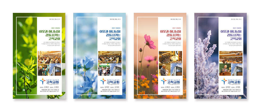 보통 교정을 컴퓨터 모니터나, 칼라 프린터로 출력해서 보시는 경우 모니터(빛의 색 RGB)와 인쇄물(잉크색 CMYK)에는 약간의 차이가 있습니다. 각 교회에서 사용되는 칼라 프린트도 옵셋 인쇄와는 인쇄 방식이 조금 달라 색상의 차이가 있습니다. 특히 종이의 재질(모조지, 아트지, 고급용지)에 의한 색의 차이도 발생할 수 있습니다.