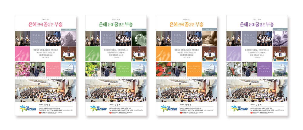 보통 교정을 컴퓨터 모니터나, 칼라 프린터로 출력해서 보시는 경우 모니터(빛의 색 RGB)와 인쇄물(잉크색 CMYK)에는 약간의 차이가 있습니다. 각 교회에서 사용되는 칼라 프린트도 옵셋 인쇄와는 인쇄 방식이 조금 달라 색상의 차이가 있습니다. 특히 종이의 재질(모조지, 아트지, 고급용지)에 의한 색의 차이도 발생할 수 있습니다.
