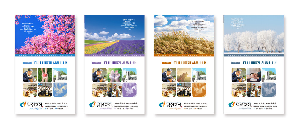 보통 교정을 컴퓨터 모니터나, 칼라 프린터로 출력해서 보시는 경우 모니터(빛의 색 RGB)와 인쇄물(잉크색 CMYK)에는 약간의 차이가 있습니다. 각 교회에서 사용되는 칼라 프린트도 옵셋 인쇄와는 인쇄 방식이 조금 달라 색상의 차이가 있습니다. 특히 종이의 재질(모조지, 아트지, 고급용지)에 의한 색의 차이도 발생할 수 있습니다.