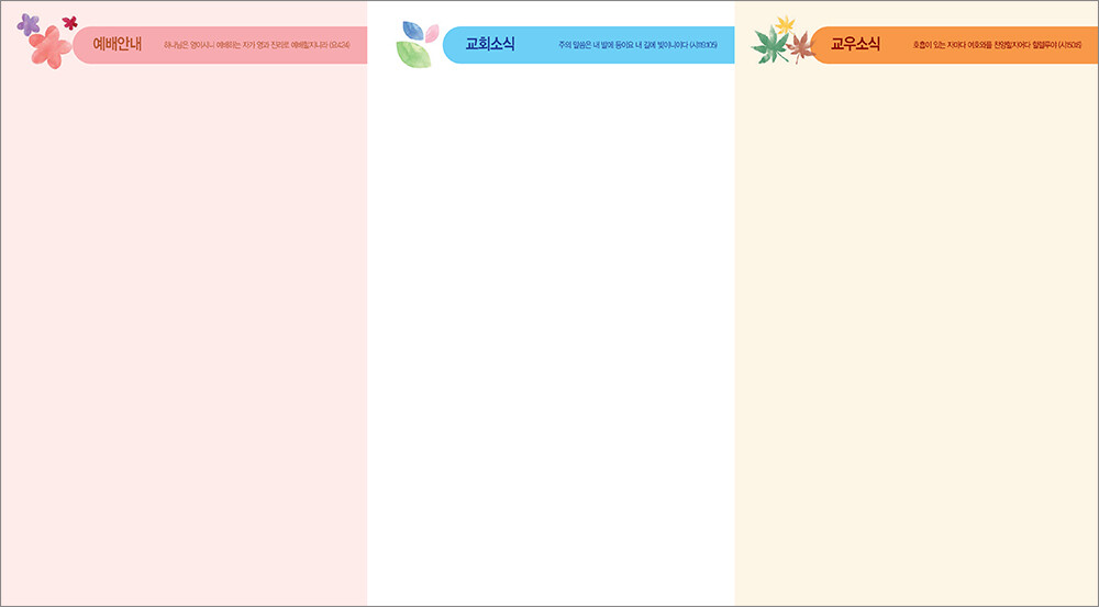 모든 디자인이 완료된 후 현재 교회가 사용중인 한글파일을 보내주시면, 새로운 주보에 맞추어 인쇄가 가능하도록 한글파일을 제작해드리고 있습니다. (한글작업 요청시 약 1-3일 정도의 시간이 소요되오니 참고해 주시기 바랍니다.)