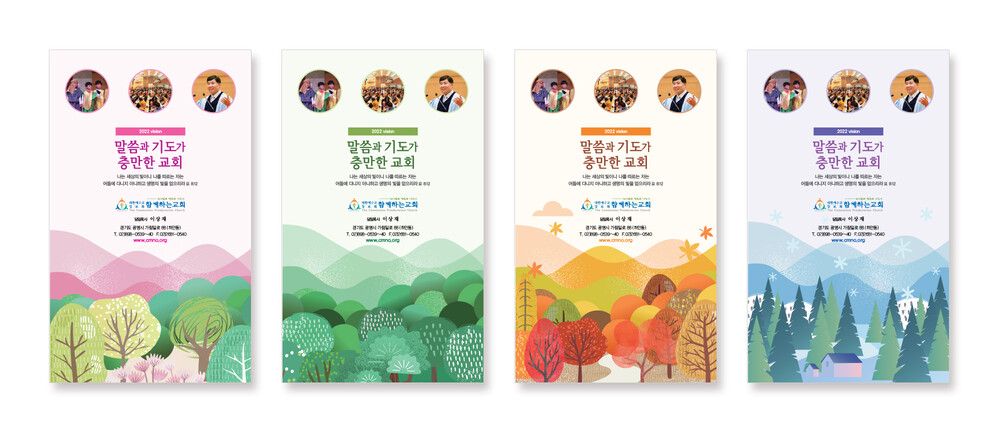 보통 교정을 컴퓨터 모니터나, 칼라 프린터로 출력해서 보시는 경우 모니터(빛의 색 RGB)와 인쇄물(잉크색 CMYK)에는 약간의 차이가 있습니다. 각 교회에서 사용되는 칼라 프린트도 옵셋 인쇄와는 인쇄 방식이 조금 달라 색상의 차이가 있습니다. 특히 종이의 재질(모조지, 아트지, 고급용지)에 의한 색의 차이도 발생할 수 있습니다.