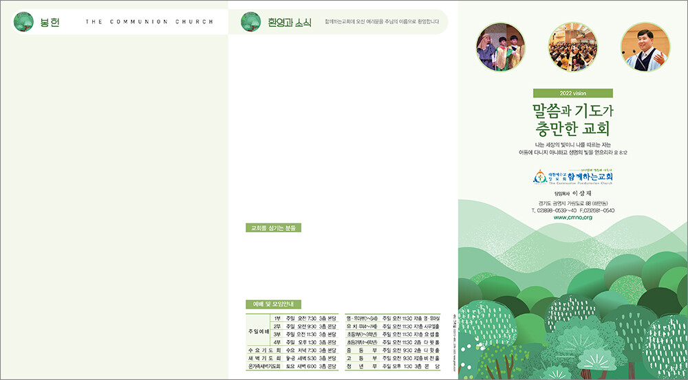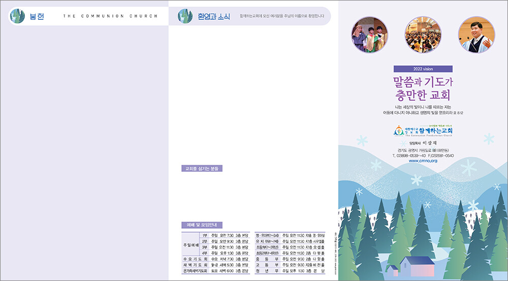 모든 디자인이 완료된 후 현재 교회가 사용중인 한글파일을 보내주시면, 새로운 주보에 맞추어 인쇄가 가능하도록 한글파일을 제작해드리고 있습니다. (한글작업 요청시 약 1-3일 정도의 시간이 소요되오니 참고해 주시기 바랍니다.)