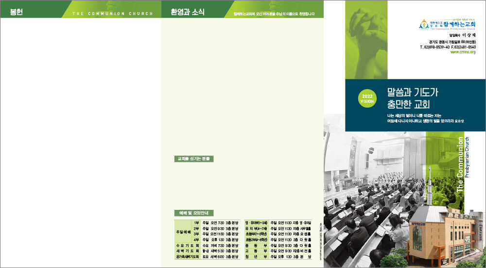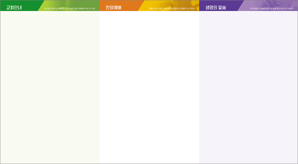 모든 디자인이 완료된 후 현재 교회가 사용중인 한글파일을 보내주시면, 새로운 주보에 맞추어 인쇄가 가능하도록 한글파일을 제작해드리고 있습니다. (한글작업 요청시 약 1-3일 정도의 시간이 소요되오니 참고해 주시기 바랍니다.)