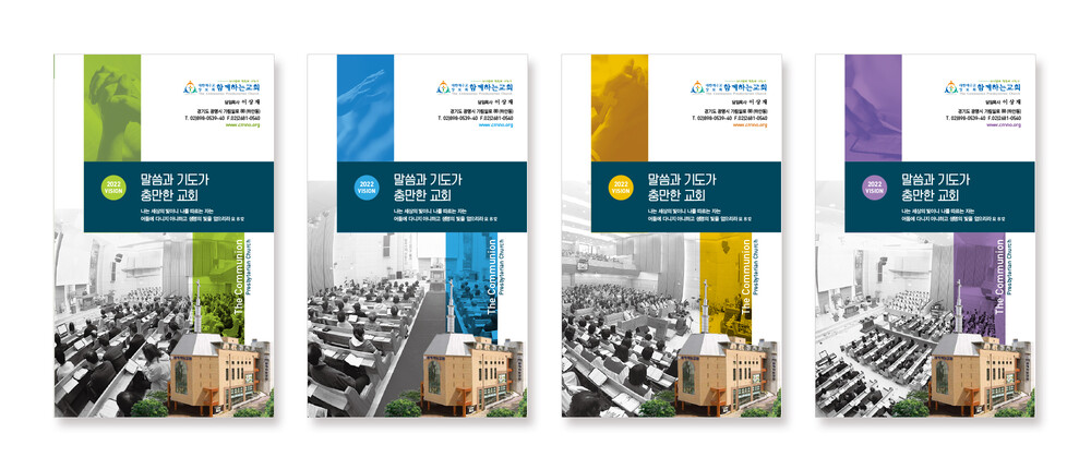 보통 교정을 컴퓨터 모니터나, 칼라 프린터로 출력해서 보시는 경우 모니터(빛의 색 RGB)와 인쇄물(잉크색 CMYK)에는 약간의 차이가 있습니다. 각 교회에서 사용되는 칼라 프린트도 옵셋 인쇄와는 인쇄 방식이 조금 달라 색상의 차이가 있습니다. 특히 종이의 재질(모조지, 아트지, 고급용지)에 의한 색의 차이도 발생할 수 있습니다.