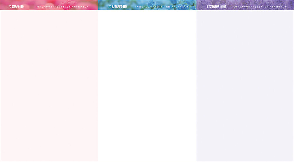모든 디자인이 완료된 후 현재 교회가 사용중인 한글파일을 보내주시면, 새로운 주보에 맞추어 인쇄가 가능하도록 한글파일을 제작해드리고 있습니다. (한글작업 요청시 약 1-3일 정도의 시간이 소요되오니 참고해 주시기 바랍니다.)