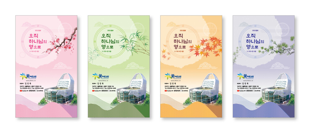 보통 교정을 컴퓨터 모니터나, 칼라 프린터로 출력해서 보시는 경우 모니터(빛의 색 RGB)와 인쇄물(잉크색 CMYK)에는 약간의 차이가 있습니다. 각 교회에서 사용되는 칼라 프린트도 옵셋 인쇄와는 인쇄 방식이 조금 달라 색상의 차이가 있습니다. 특히 종이의 재질(모조지, 아트지, 고급용지)에 의한 색의 차이도 발생할 수 있습니다.