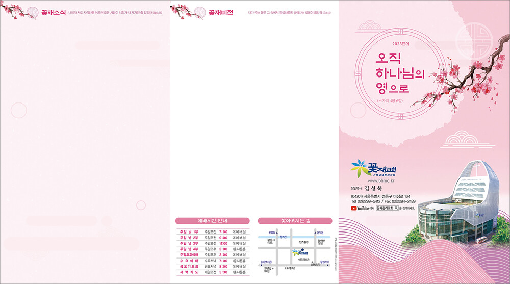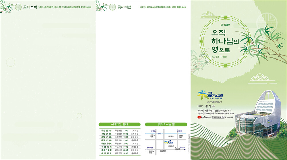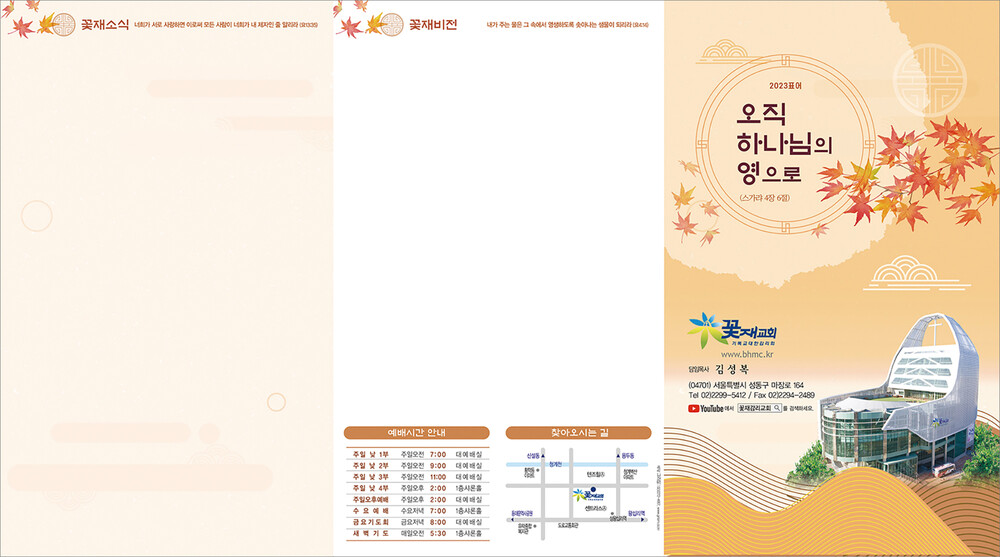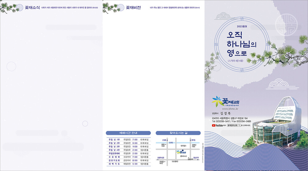 모든 디자인이 완료된 후 현재 교회가 사용중인 한글파일을 보내주시면, 새로운 주보에 맞추어 인쇄가 가능하도록 한글파일을 제작해드리고 있습니다. (한글작업 요청시 약 1-3일 정도의 시간이 소요되오니 참고해 주시기 바랍니다.)