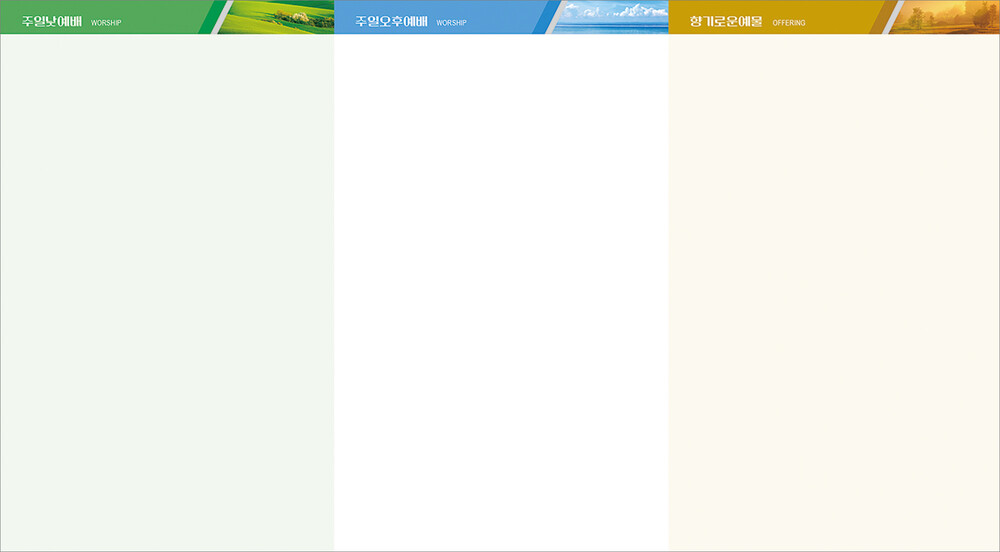 모든 디자인이 완료된 후 현재 교회가 사용중인 한글파일을 보내주시면, 새로운 주보에 맞추어 인쇄가 가능하도록 한글파일을 제작해드리고 있습니다. (한글작업 요청시 약 1-3일 정도의 시간이 소요되오니 참고해 주시기 바랍니다.)