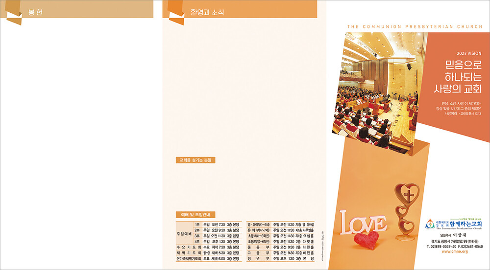 모든 디자인이 완료된 후 현재 교회가 사용중인 한글파일을 보내주시면, 새로운 주보에 맞추어 인쇄가 가능하도록 한글파일을 제작해드리고 있습니다. (한글작업 요청시 약 1-3일 정도의 시간이 소요되오니 참고해 주시기 바랍니다.)