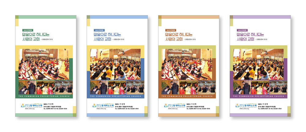 보통 교정을 컴퓨터 모니터나, 칼라 프린터로 출력해서 보시는 경우 모니터(빛의 색 RGB)와 인쇄물(잉크색 CMYK)에는 약간의 차이가 있습니다. 각 교회에서 사용되는 칼라 프린트도 옵셋 인쇄와는 인쇄 방식이 조금 달라 색상의 차이가 있습니다. 특히 종이의 재질(모조지, 아트지, 고급용지)에 의한 색의 차이도 발생할 수 있습니다.