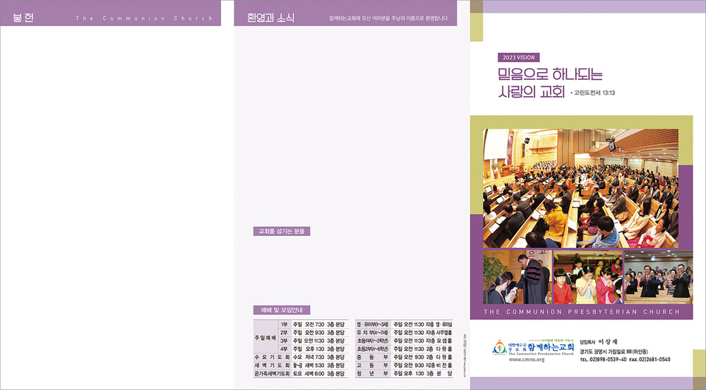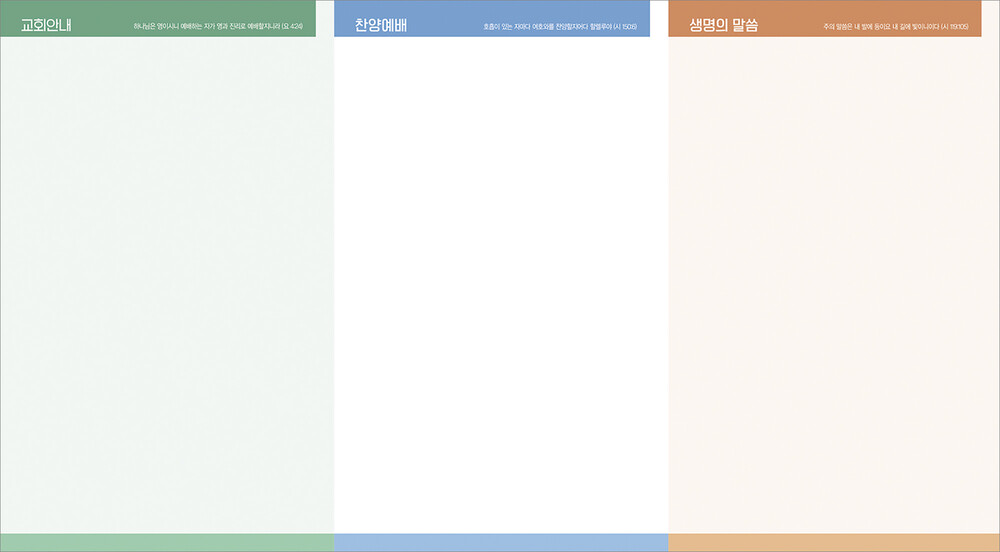 모든 디자인이 완료된 후 현재 교회가 사용중인 한글파일을 보내주시면, 새로운 주보에 맞추어 인쇄가 가능하도록 한글파일을 제작해드리고 있습니다. (한글작업 요청시 약 1-3일 정도의 시간이 소요되오니 참고해 주시기 바랍니다.)