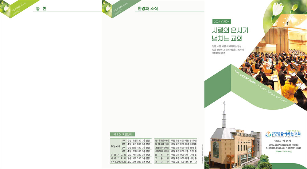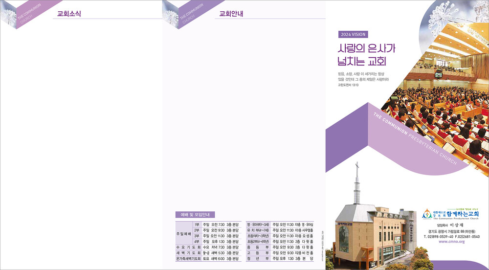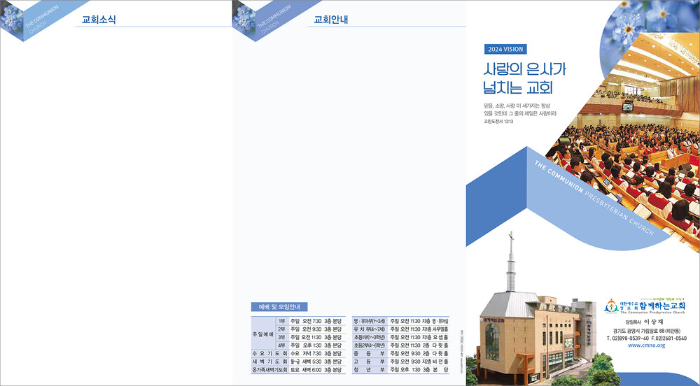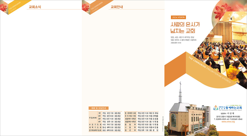 모든 디자인이 완료된 후 현재 교회가 사용중인 한글파일을 보내주시면, 새로운 주보에 맞추어 인쇄가 가능하도록 한글파일을 제작해드리고 있습니다. (한글작업 요청시 약 1-3일 정도의 시간이 소요되오니 참고해 주시기 바랍니다.)