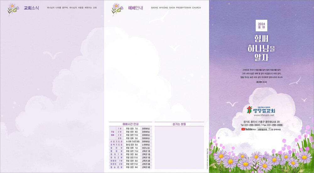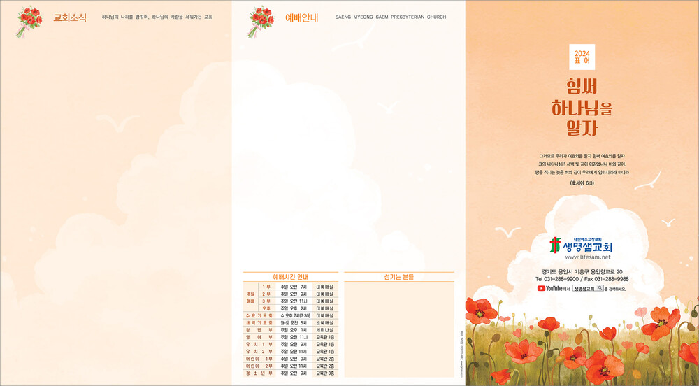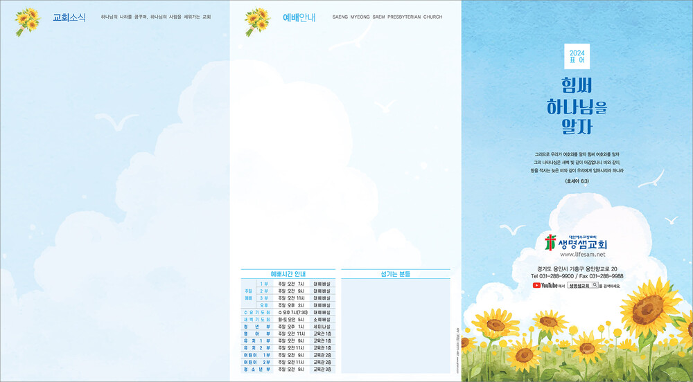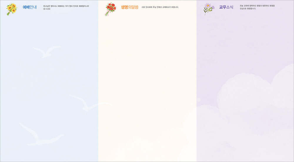 모든 디자인이 완료된 후 현재 교회가 사용중인 한글파일을 보내주시면, 새로운 주보에 맞추어 인쇄가 가능하도록 한글파일을 제작해드리고 있습니다. (한글작업 요청시 약 1-3일 정도의 시간이 소요되오니 참고해 주시기 바랍니다.)
