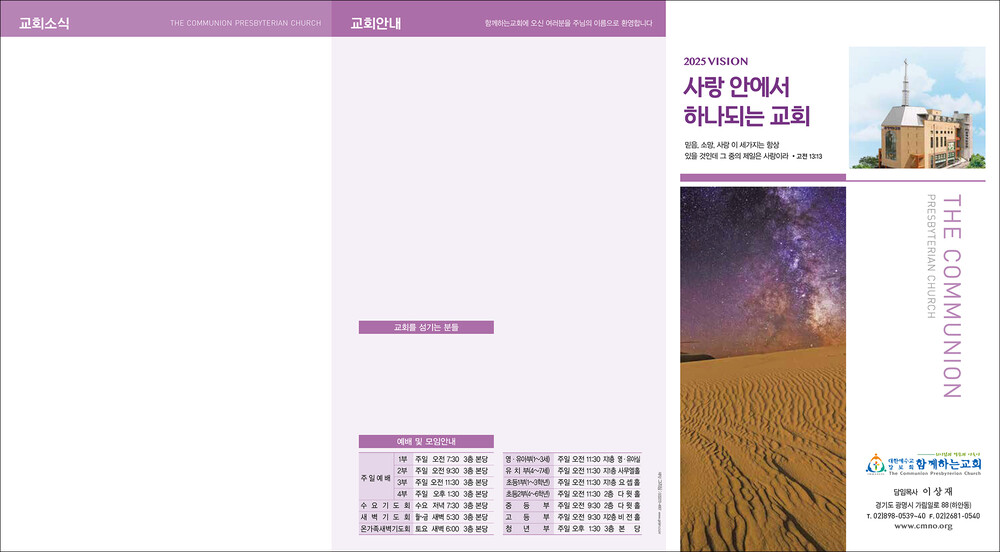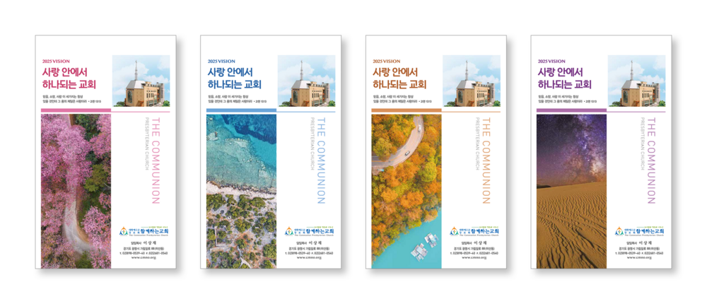 보통 교정을 컴퓨터 모니터나, 칼라 프린터로 출력해서 보시는 경우 모니터(빛의 색 RGB)와 인쇄물(잉크색 CMYK)에는 약간의 차이가 있습니다. 각 교회에서 사용되는 칼라 프린트도 옵셋 인쇄와는 인쇄 방식이 조금 달라 색상의 차이가 있습니다. 특히 종이의 재질(모조지, 아트지, 고급용지)에 의한 색의 차이도 발생할 수 있습니다.