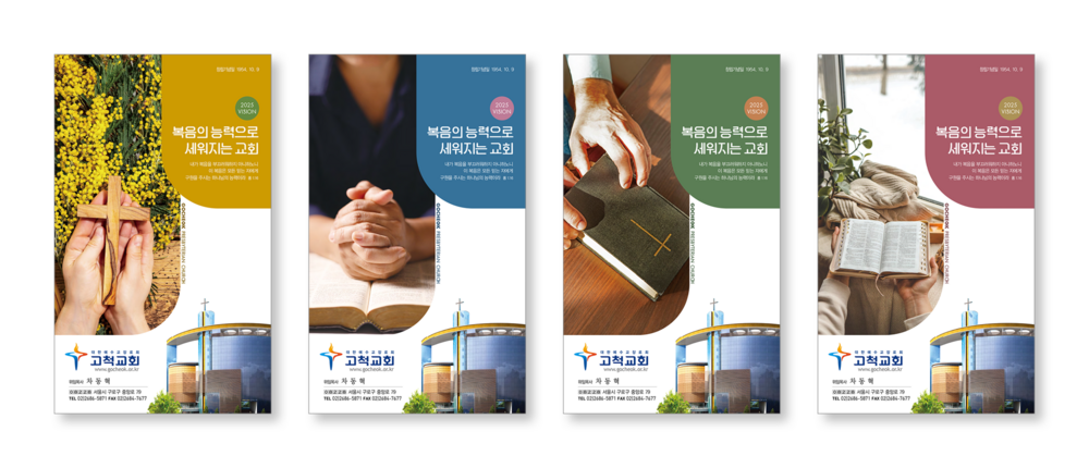 보통 교정을 컴퓨터 모니터나, 칼라 프린터로 출력해서 보시는 경우 모니터(빛의 색 RGB)와 인쇄물(잉크색 CMYK)에는 약간의 차이가 있습니다. 각 교회에서 사용되는 칼라 프린트도 옵셋 인쇄와는 인쇄 방식이 조금 달라 색상의 차이가 있습니다. 특히 종이의 재질(모조지, 아트지, 고급용지)에 의한 색의 차이도 발생할 수 있습니다.