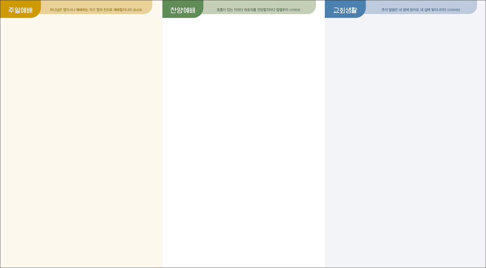 모든 디자인이 완료된 후 현재 교회가 사용중인 한글파일을 보내주시면, 새로운 주보에 맞추어 인쇄가 가능하도록 한글파일을 제작해드리고 있습니다. (한글작업 요청시 약 1-3일 정도의 시간이 소요되오니 참고해 주시기 바랍니다.)