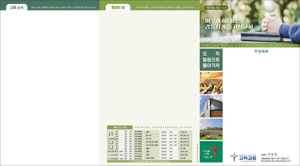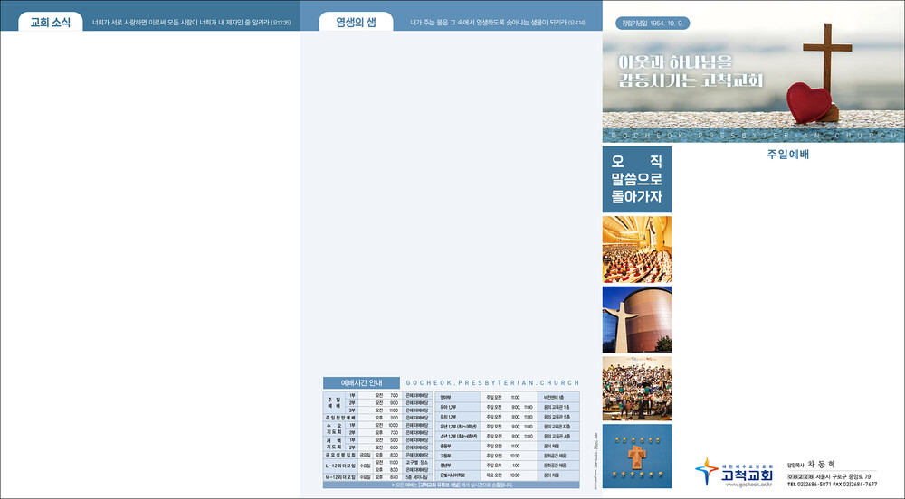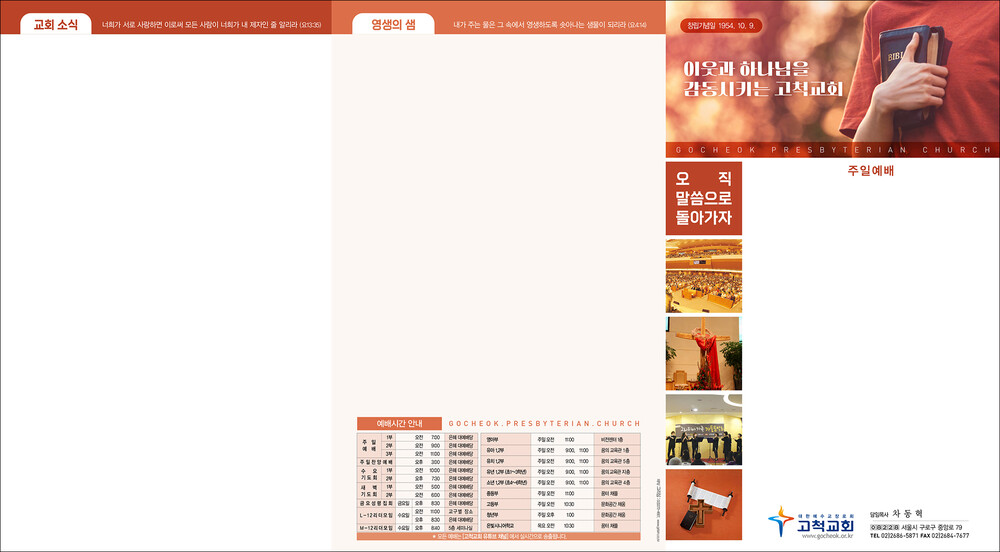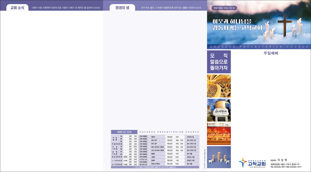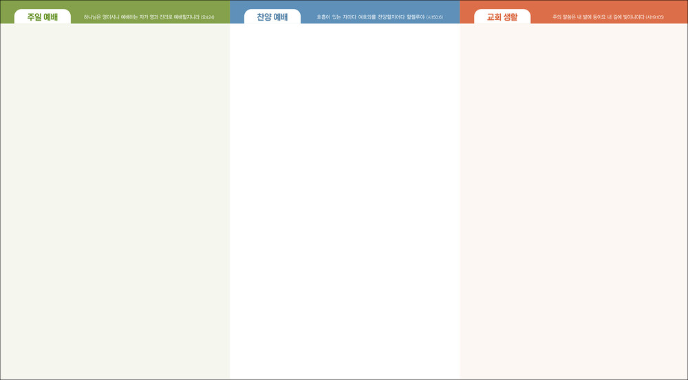 모든 디자인이 완료된 후 현재 교회가 사용중인 한글파일을 보내주시면, 새로운 주보에 맞추어 인쇄가 가능하도록 한글파일을 제작해드리고 있습니다. (한글작업 요청시 약 1-3일 정도의 시간이 소요되오니 참고해 주시기 바랍니다.)