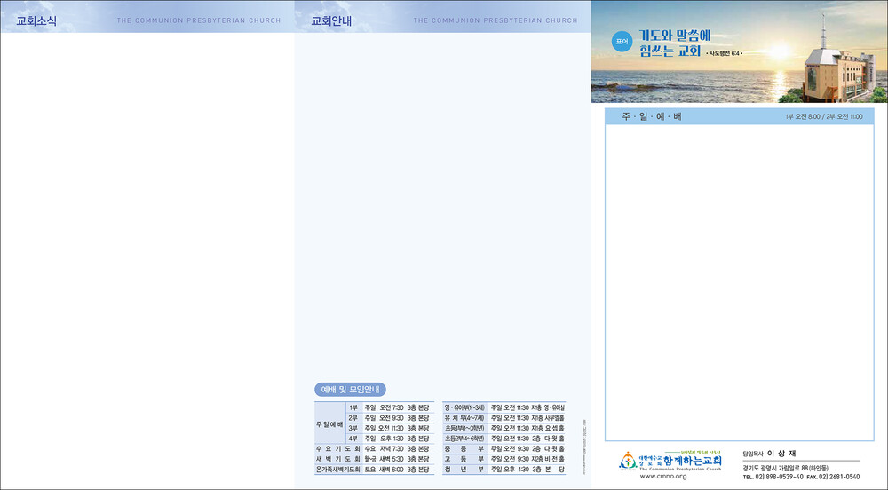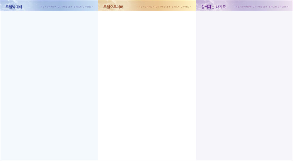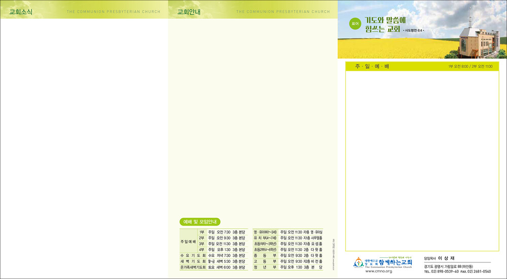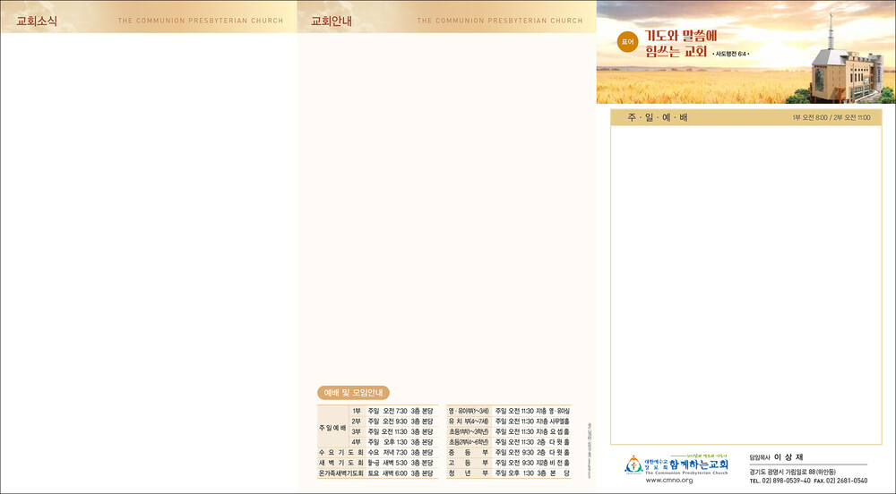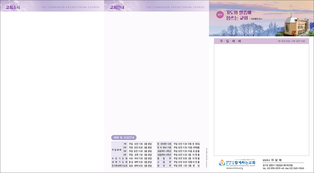모든 디자인이 완료된 후 현재 교회가 사용중인 한글파일을 보내주시면, 새로운 주보에 맞추어 인쇄가 가능하도록 한글파일을 제작해드리고 있습니다. (한글작업 요청시 약 1-3일 정도의 시간이 소요되오니 참고해 주시기 바랍니다.)