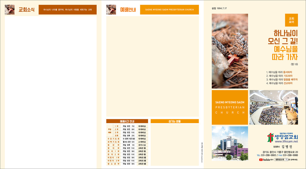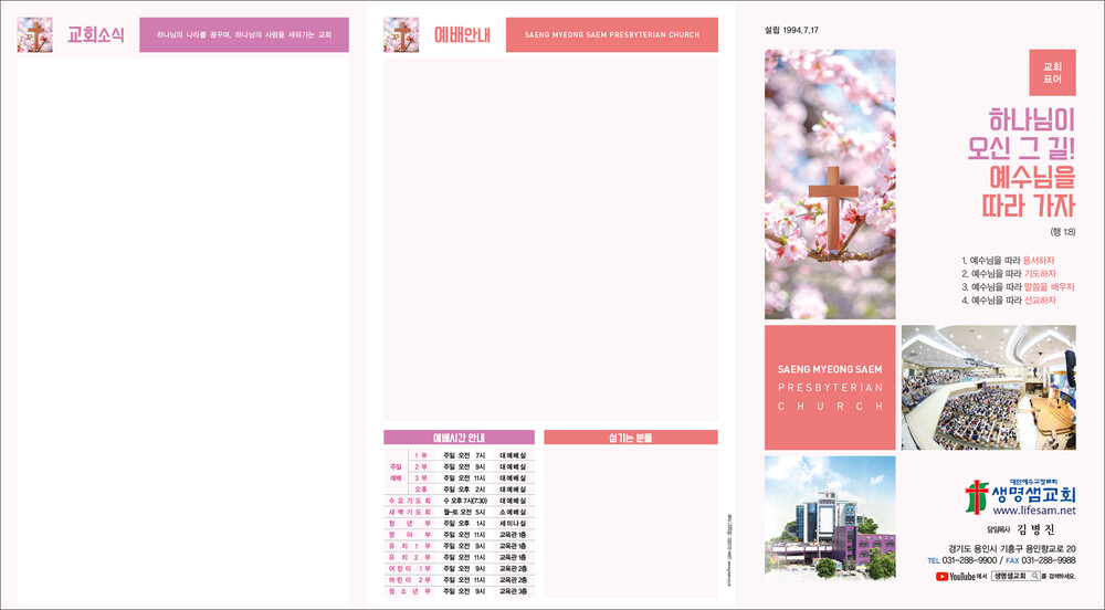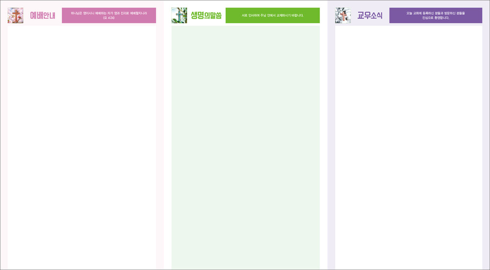 모든 디자인이 완료된 후 현재 교회가 사용중인 한글파일을 보내주시면, 새로운 주보에 맞추어 인쇄가 가능하도록 한글파일을 제작해드리고 있습니다. (한글작업 요청시 약 1-3일 정도의 시간이 소요되오니 참고해 주시기 바랍니다.)