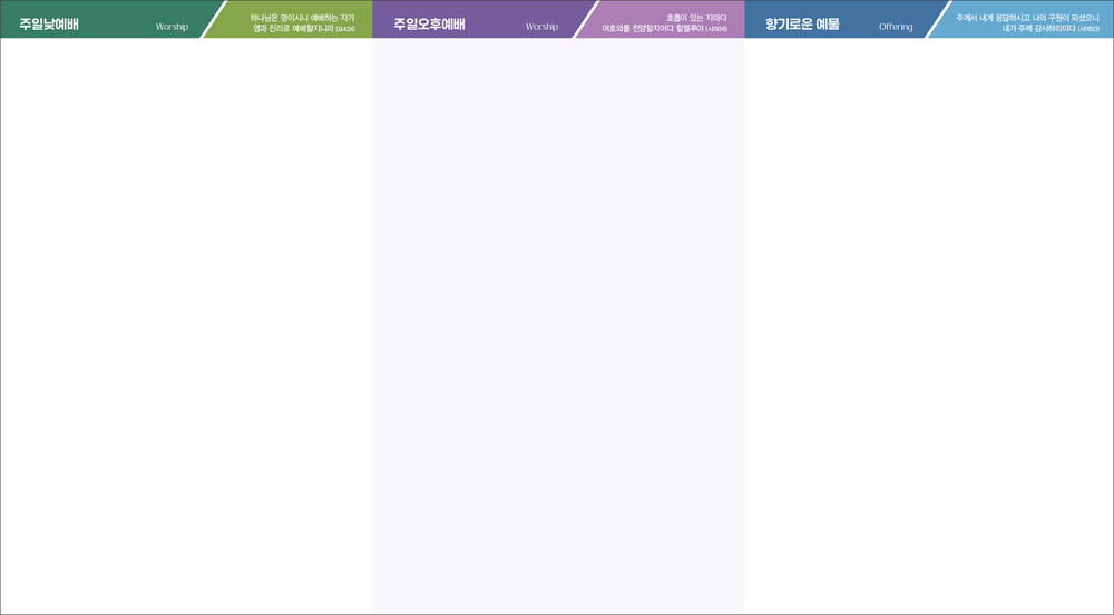 모든 디자인이 완료된 후 현재 교회가 사용중인 한글파일을 보내주시면, 새로운 주보에 맞추어 인쇄가 가능하도록 한글파일을 제작해드리고 있습니다. (한글작업 요청시 약 1-3일 정도의 시간이 소요되오니 참고해 주시기 바랍니다.)