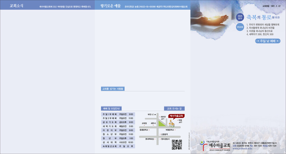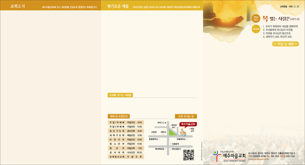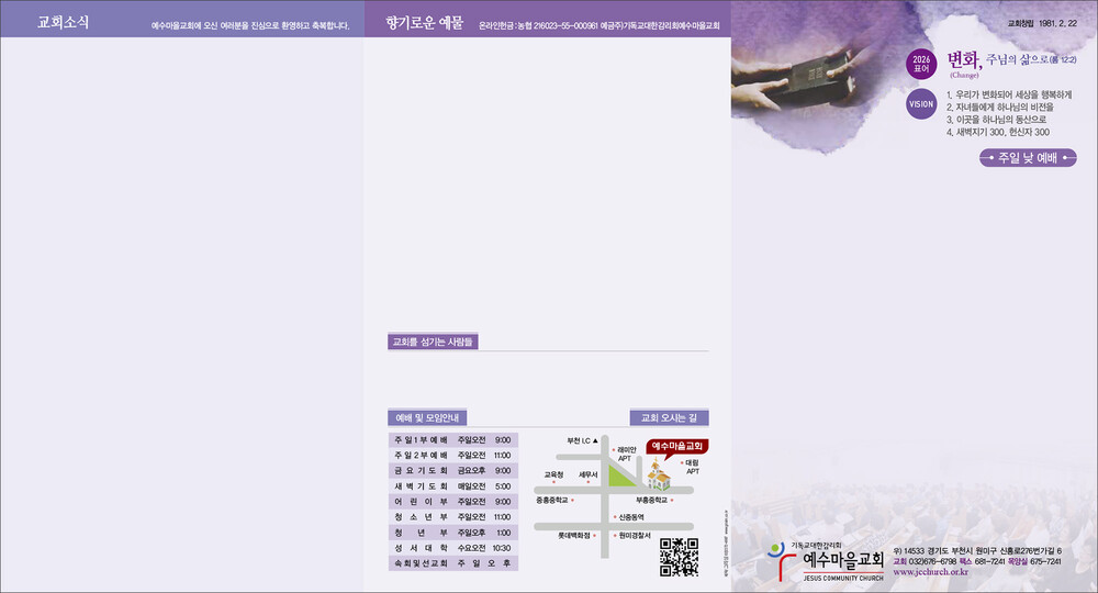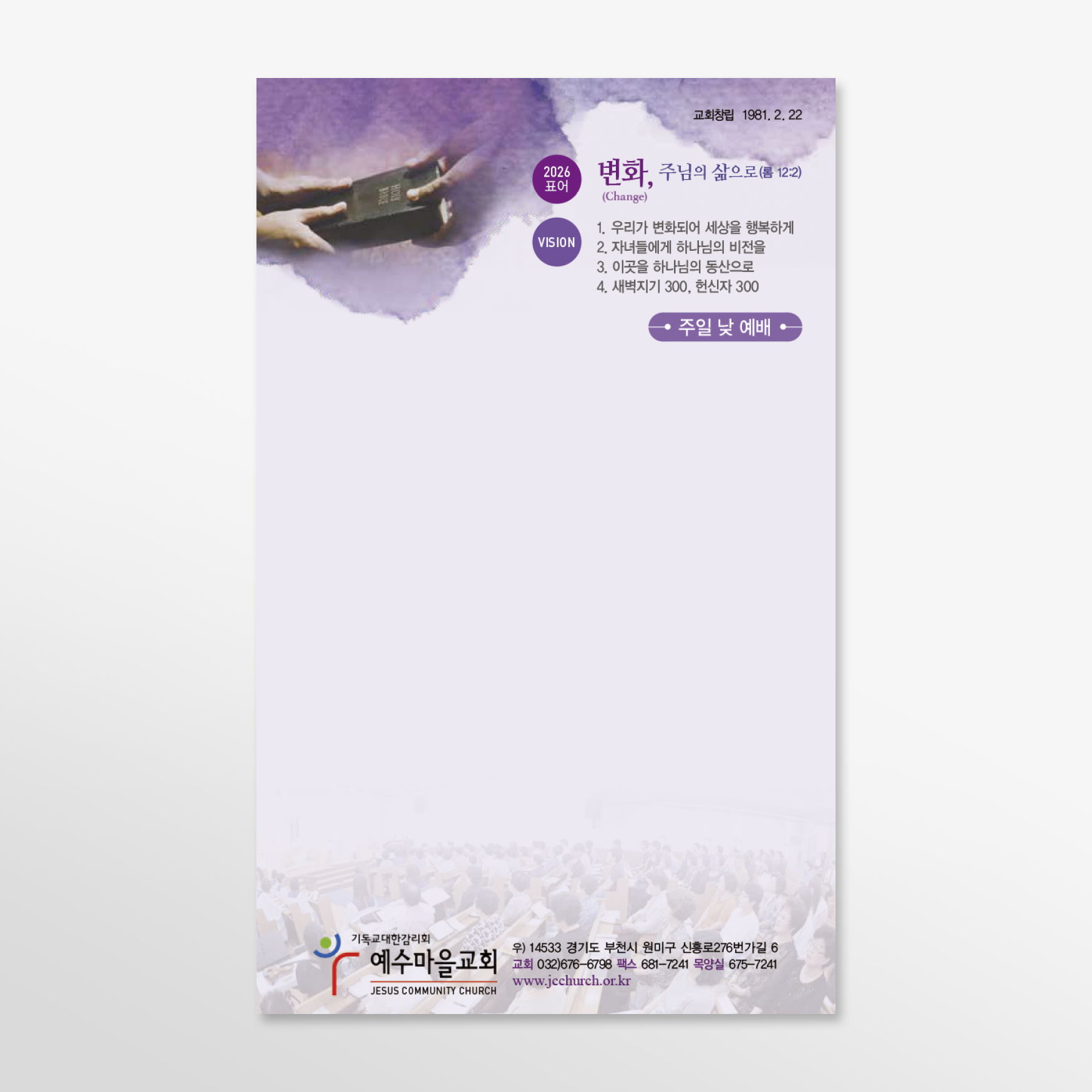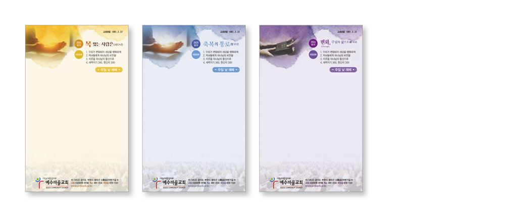 모든 디자인이 완료된 후 현재 교회가 사용중인 한글파일을 보내주시면, 새로운 주보에 맞추어 인쇄가 가능하도록 한글파일을 제작해드리고 있습니다. (한글작업 요청시 약 1-3일 정도의 시간이 소요되오니 참고해 주시기 바랍니다.)