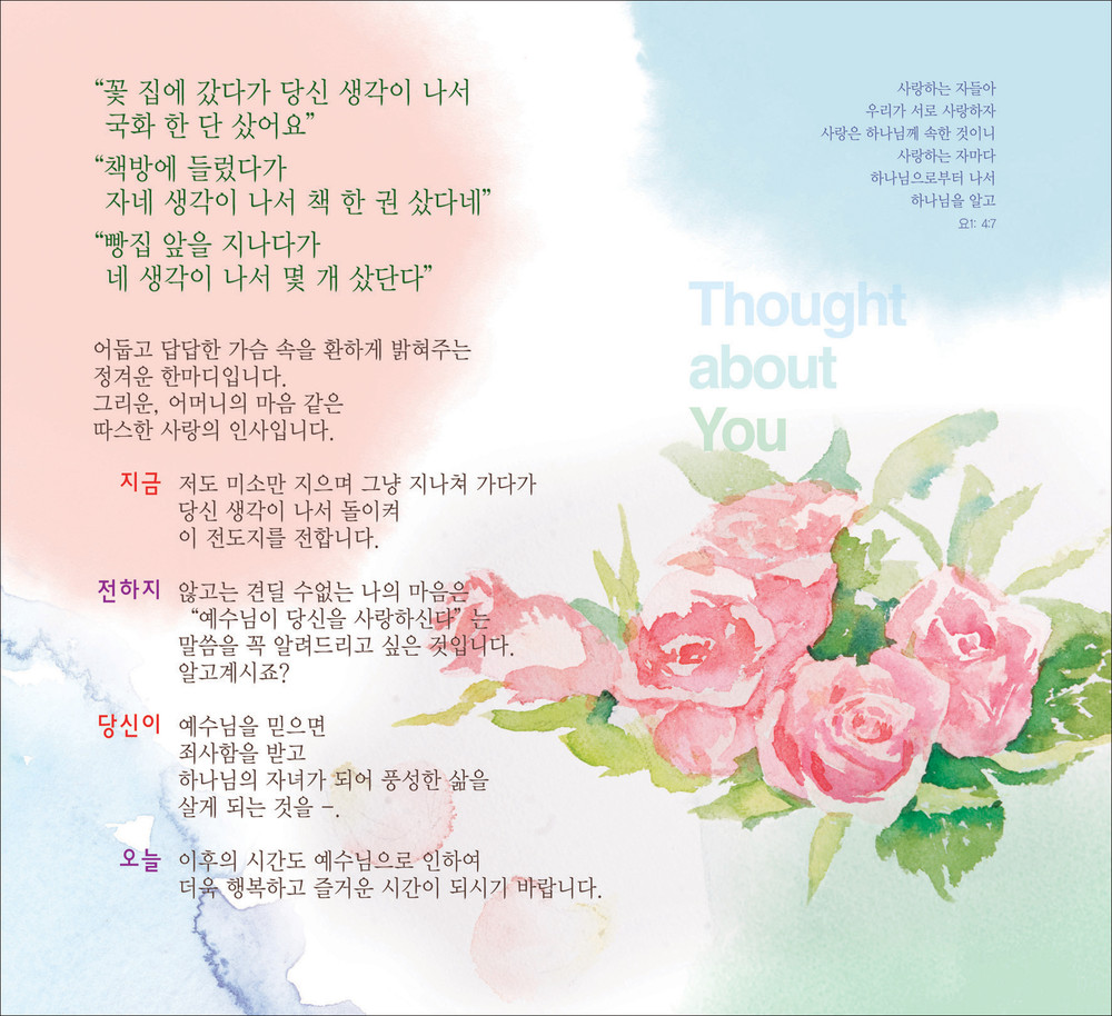 보통 교정을 컴퓨터 모니터나, 칼라 프린터로 출력해서 보시는 경우 모니터(빛의 색 RGB)와 인쇄물(잉크색 CMYK)에는 약간의 차이가 있습니다. 각 교회에서 사용되는 칼라 프린트도 옵셋 인쇄와는 인쇄 방식이 조금 달라 색상의 차이가 있습니다. 특히 종이의 재질(모조지, 아트지, 고급용지)에 의한 색의 차이도 발생할 수 있습니다.