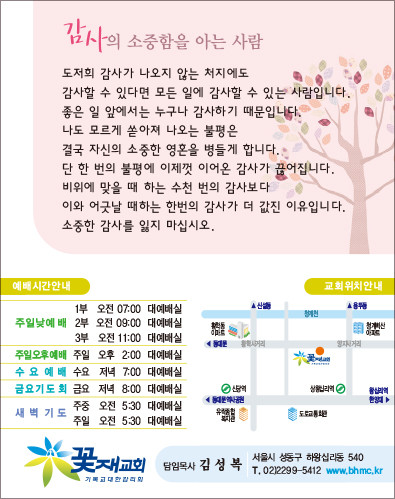 보통 교정을 컴퓨터 모니터나, 칼라 프린터로 출력해서 보시는 경우 모니터(빛의 색 RGB)와 인쇄물(잉크색 CMYK)에는 약간의 차이가 있습니다. 각 교회에서 사용되는 칼라 프린트도 옵셋 인쇄와는 인쇄 방식이 조금 달라 색상의 차이가 있습니다. 특히 종이의 재질(모조지, 아트지, 고급용지)에 의한 색의 차이도 발생할 수 있습니다.