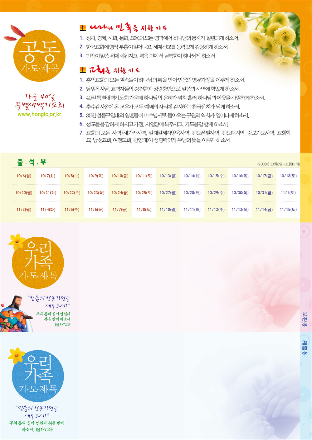 보통 교정을 컴퓨터 모니터나, 칼라 프린터로 출력해서 보시는 경우 모니터(빛의 색 RGB)와 인쇄물(잉크색 CMYK)에는 약간의 차이가 있습니다. 각 교회에서 사용되는 칼라 프린트도 옵셋 인쇄와는 인쇄 방식이 조금 달라 색상의 차이가 있습니다. 특히 종이의 재질(모조지, 아트지, 고급용지)에 의한 색의 차이도 발생할 수 있습니다.