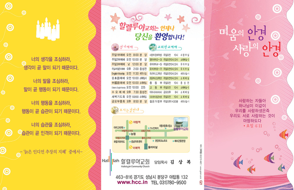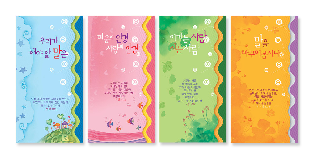 보통 교정을 컴퓨터 모니터나, 칼라 프린터로 출력해서 보시는 경우 모니터(빛의 색 RGB)와 인쇄물(잉크색 CMYK)에는 약간의 차이가 있습니다. 각 교회에서 사용되는 칼라 프린트도 옵셋 인쇄와는 인쇄 방식이 조금 달라 색상의 차이가 있습니다. 특히 종이의 재질(모조지, 아트지, 고급용지)에 의한 색의 차이도 발생할 수 있습니다.