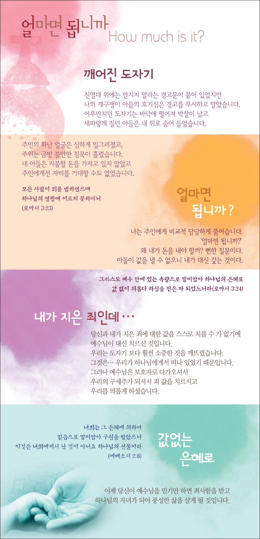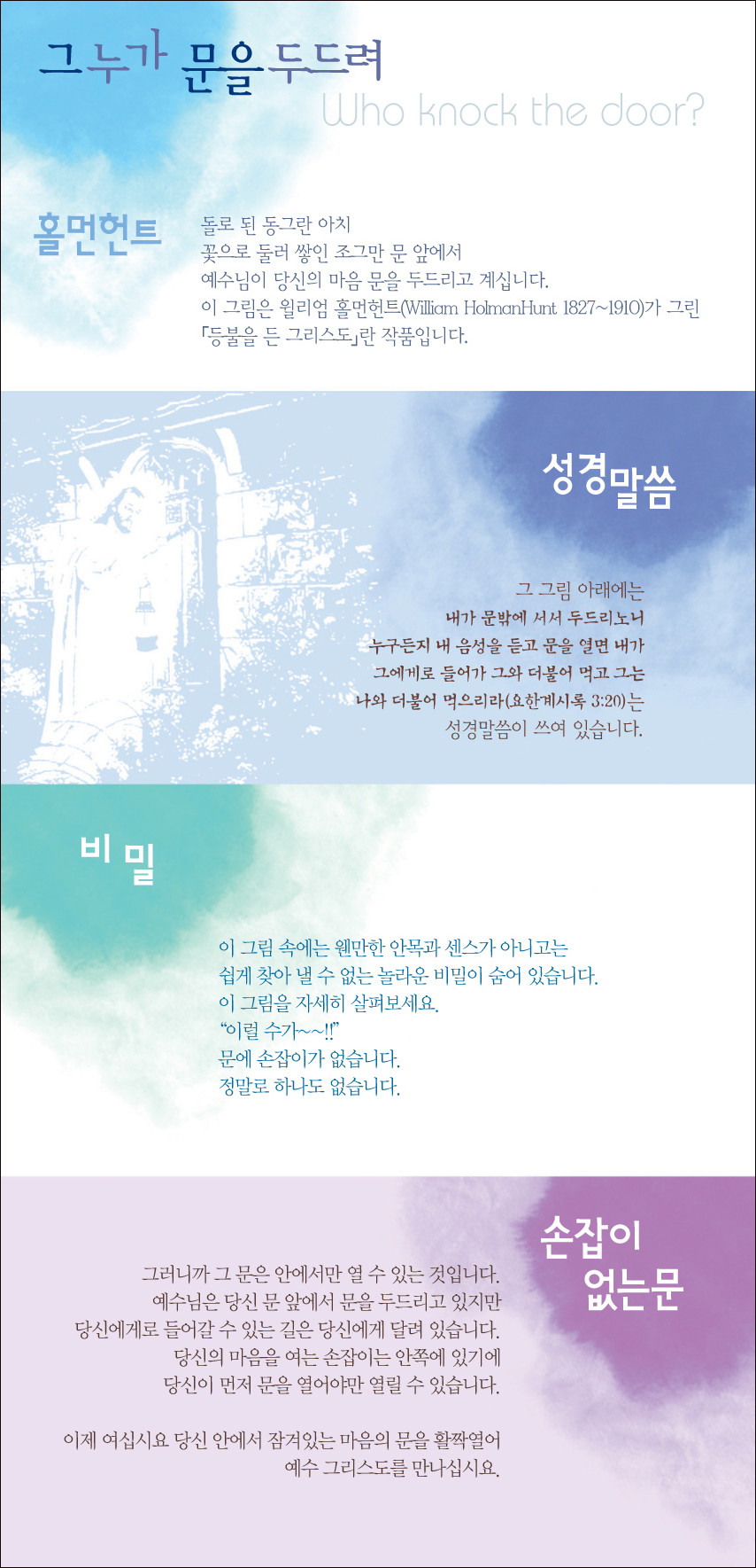 보통 교정을 컴퓨터 모니터나, 칼라 프린터로 출력해서 보시는 경우 모니터(빛의 색 RGB)와 인쇄물(잉크색 CMYK)에는 약간의 차이가 있습니다. 각 교회에서 사용되는 칼라 프린트도 옵셋 인쇄와는 인쇄 방식이 조금 달라 색상의 차이가 있습니다. 특히 종이의 재질(모조지, 아트지, 고급용지)에 의한 색의 차이도 발생할 수 있습니다.