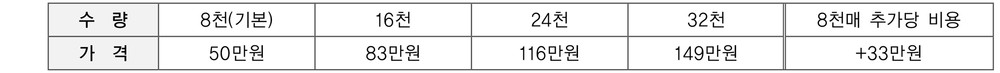 기본단위(8천/16천/24천....)로 주문이 가능하며, 한번에 인쇄하는 수량/비용입니다.