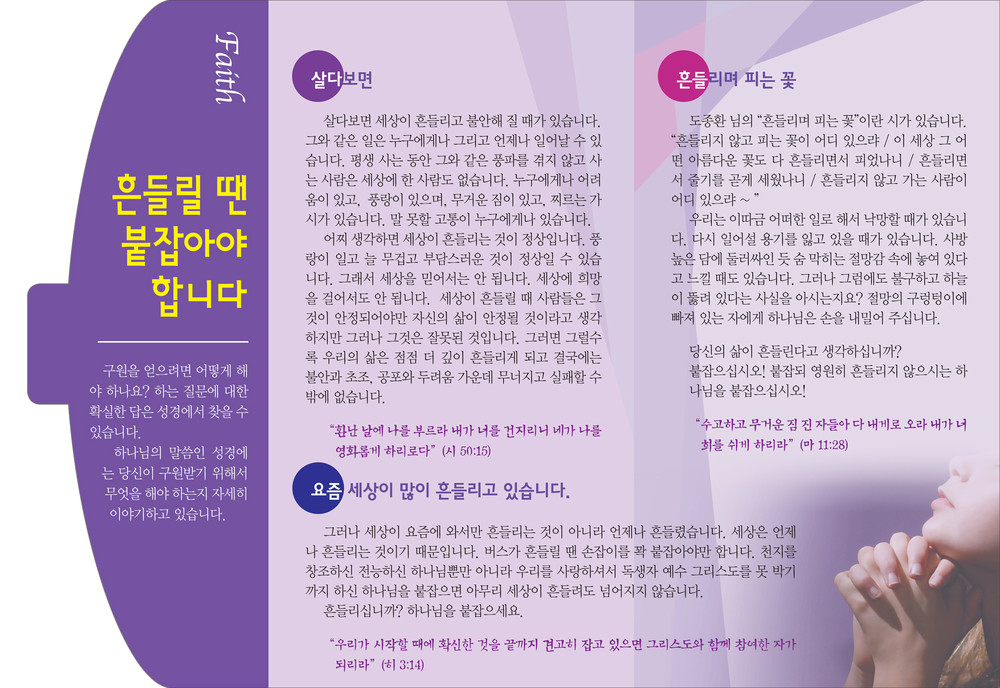 보통 교정을 컴퓨터 모니터나, 칼라 프린터로 출력해서 보시는 경우 모니터(빛의 색 RGB)와 인쇄물(잉크색 CMYK)에는 약간의 차이가 있습니다. 각 교회에서 사용되는 칼라 프린트도 옵셋 인쇄와는 인쇄 방식이 조금 달라 색상의 차이가 있습니다. 특히 종이의 재질(모조지, 아트지, 고급용지)에 의한 색의 차이도 발생할 수 있습니다.