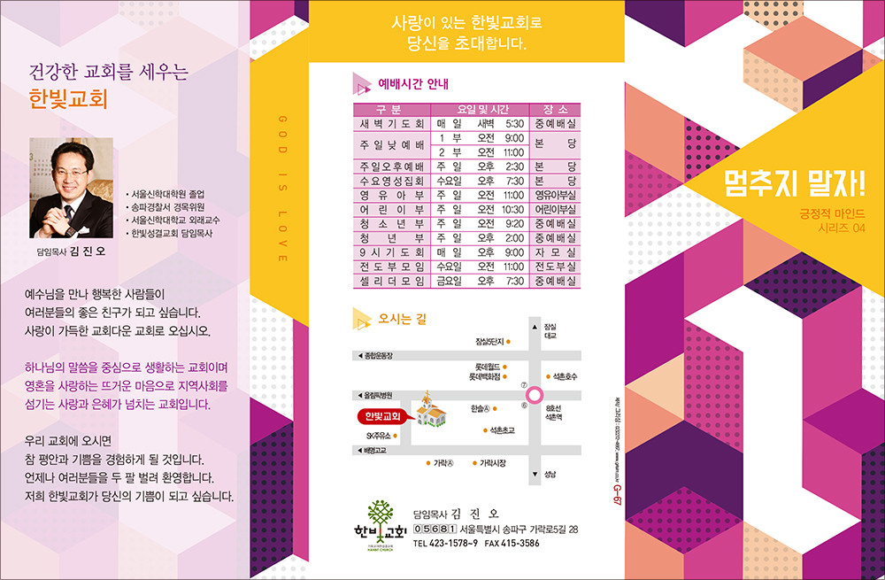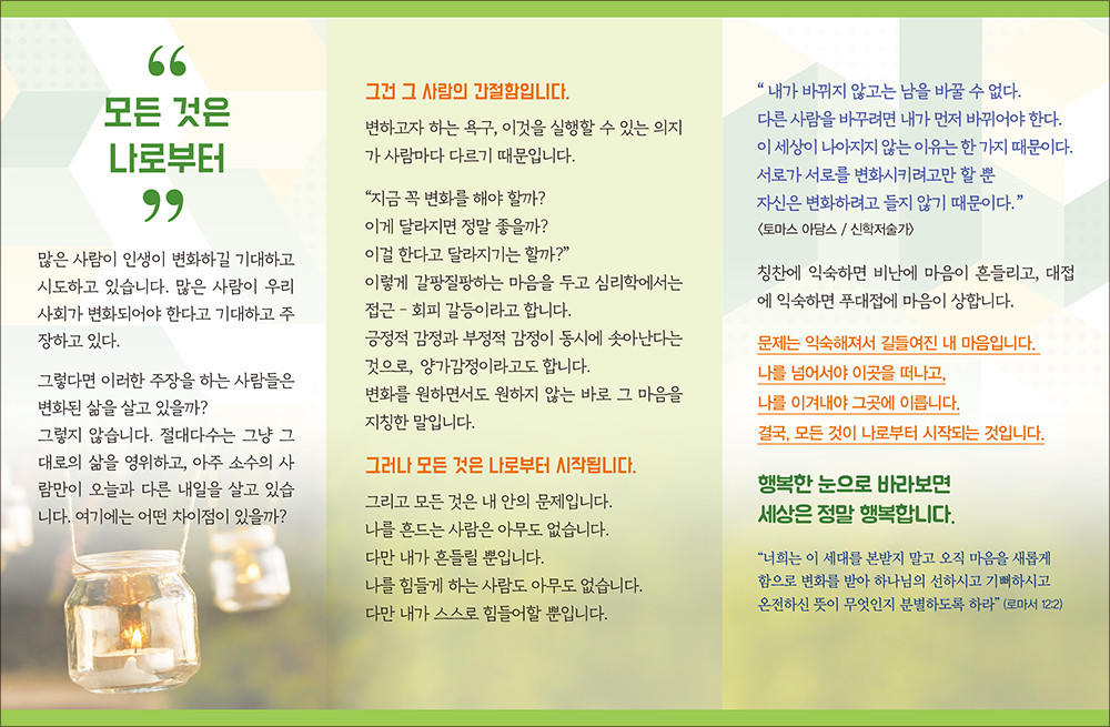 보통 교정을 컴퓨터 모니터나, 칼라 프린터로 출력해서 보시는 경우 모니터(빛의 색 RGB)와 인쇄물(잉크색 CMYK)에는 약간의 차이가 있습니다. 각 교회에서 사용되는 칼라 프린트도 옵셋 인쇄와는 인쇄 방식이 조금 달라 색상의 차이가 있습니다. 특히 종이의 재질(모조지, 아트지, 고급용지)에 의한 색의 차이도 발생할 수 있습니다.