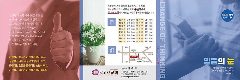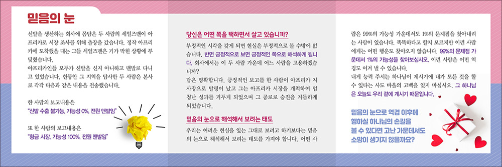 보통 교정을 컴퓨터 모니터나, 칼라 프린터로 출력해서 보시는 경우 모니터(빛의 색 RGB)와 인쇄물(잉크색 CMYK)에는 약간의 차이가 있습니다. 각 교회에서 사용되는 칼라 프린트도 옵셋 인쇄와는 인쇄 방식이 조금 달라 색상의 차이가 있습니다. 특히 종이의 재질(모조지, 아트지, 고급용지)에 의한 색의 차이도 발생할 수 있습니다.