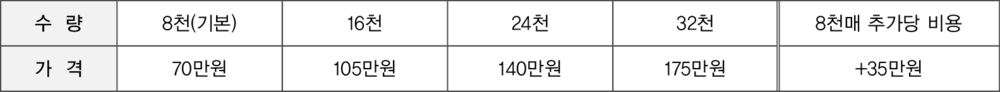 기본단위(8천/16천/24천....)로 주문이 가능하며, 한번에 인쇄하는 수량/비용입니다.