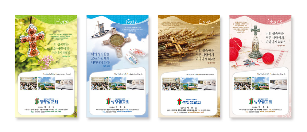 보통 교정을 컴퓨터 모니터나, 칼라 프린터로 출력해서 보시는 경우 모니터(빛의 색 RGB)와 인쇄물(잉크색 CMYK)에는 약간의 차이가 있습니다. 각 교회에서 사용되는 칼라 프린트도 옵셋 인쇄와는 인쇄 방식이 조금 달라 색상의 차이가 있습니다. 특히 종이의 재질(모조지, 아트지, 고급용지)에 의한 색의 차이도 발생할 수 있습니다.