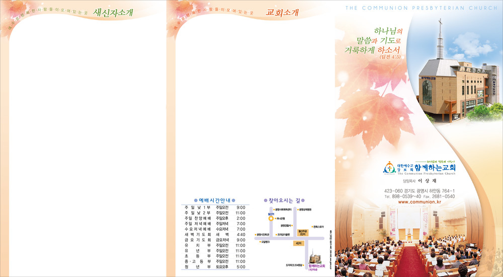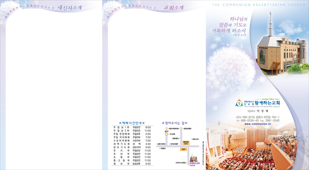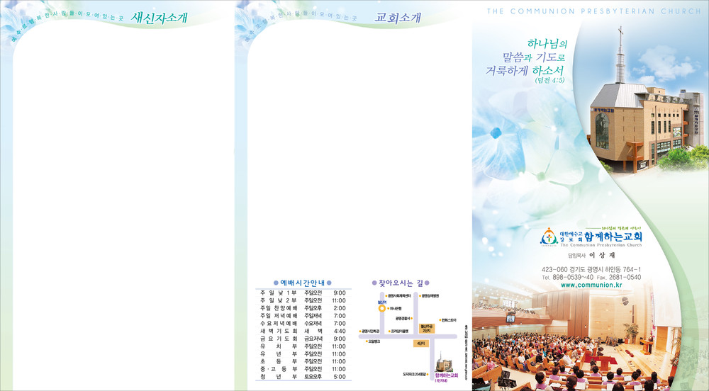 모든 디자인이 완료된 후 현재 교회가 사용중인 한글파일을 보내주시면, 새로운 주보에 맞추어 인쇄가 가능하도록 한글파일을 제작해드리고 있습니다. (한글작업 요청시 약 1-3일 정도의 시간이 소요되오니 참고해 주시기 바랍니다.)