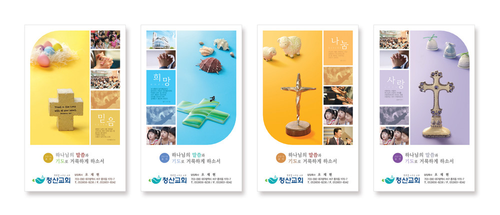 보통 교정을 컴퓨터 모니터나, 칼라 프린터로 출력해서 보시는 경우 모니터(빛의 색 RGB)와 인쇄물(잉크색 CMYK)에는 약간의 차이가 있습니다. 각 교회에서 사용되는 칼라 프린트도 옵셋 인쇄와는 인쇄 방식이 조금 달라 색상의 차이가 있습니다. 특히 종이의 재질(모조지, 아트지, 고급용지)에 의한 색의 차이도 발생할 수 있습니다.