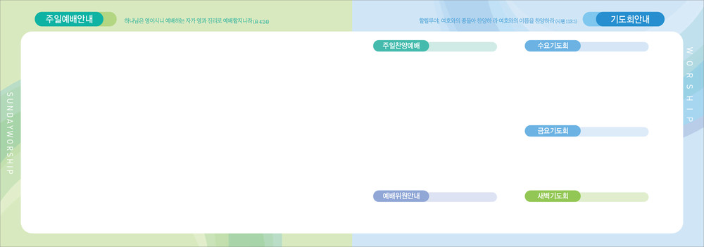 모든 디자인이 완료된 후 현재 교회가 사용중인 한글파일을 보내주시면, 새로운 주보에 맞추어 인쇄가 가능하도록 한글파일을 제작해드리고 있습니다. (한글작업 요청시 약 1-3일 정도의 시간이 소요되오니 참고해 주시기 바랍니다.)
