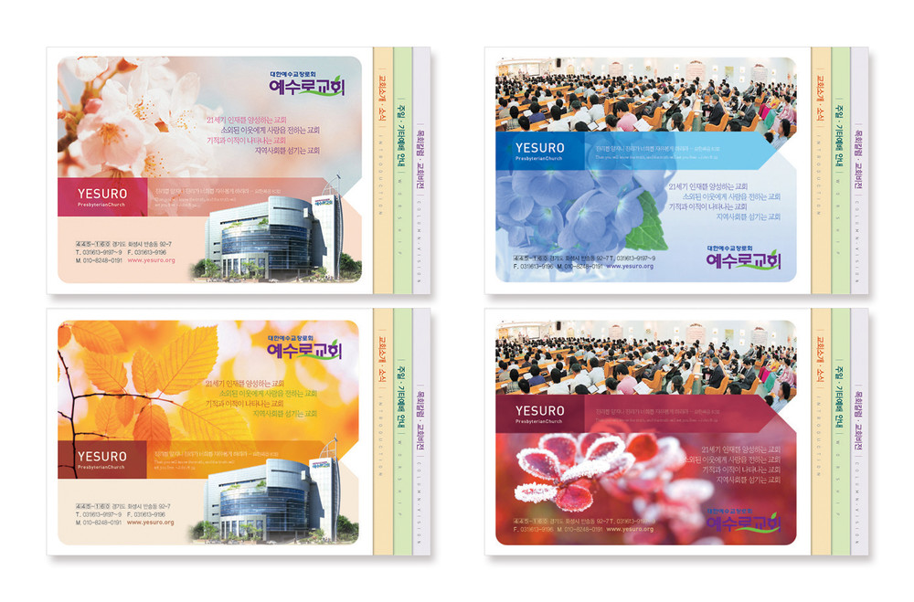 보통 교정을 컴퓨터 모니터나, 칼라 프린터로 출력해서 보시는 경우 모니터(빛의 색 RGB)와 인쇄물(잉크색 CMYK)에는 약간의 차이가 있습니다. 각 교회에서 사용되는 칼라 프린트도 옵셋 인쇄와는 인쇄 방식이 조금 달라 색상의 차이가 있습니다. 특히 종이의 재질(모조지, 아트지, 고급용지)에 의한 색의 차이도 발생할 수 있습니다.