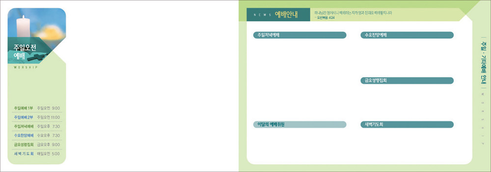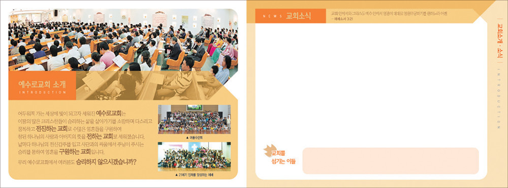 모든 디자인이 완료된 후 현재 교회가 사용중인 한글파일을 보내주시면, 새로운 주보에 맞추어 인쇄가 가능하도록 한글파일을 제작해드리고 있습니다. (한글작업 요청시 약 1-3일 정도의 시간이 소요되오니 참고해 주시기 바랍니다.)