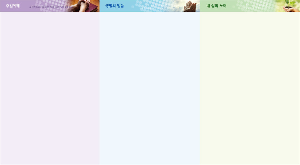 모든 디자인이 완료된 후 현재 교회가 사용중인 한글파일을 보내주시면, 새로운 주보에 맞추어 인쇄가 가능하도록 한글파일을 제작해드리고 있습니다. (한글작업 요청시 약 1-3일 정도의 시간이 소요되오니 참고해 주시기 바랍니다.)