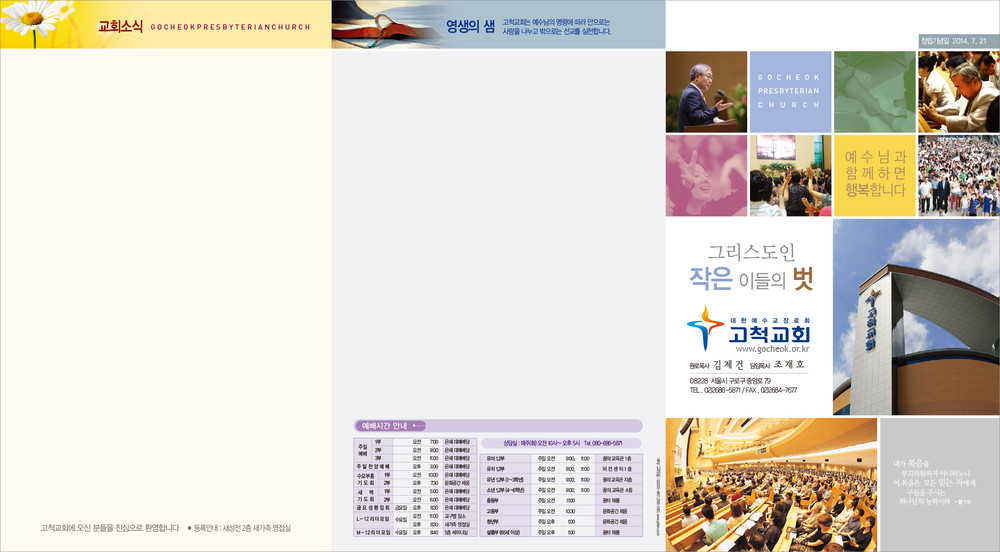 모든 디자인이 완료된 후 현재 교회가 사용중인 한글파일을 보내주시면, 새로운 주보에 맞추어 인쇄가 가능하도록 한글파일을 제작해드리고 있습니다. (한글작업 요청시 약 1-3일 정도의 시간이 소요되오니 참고해 주시기 바랍니다.)