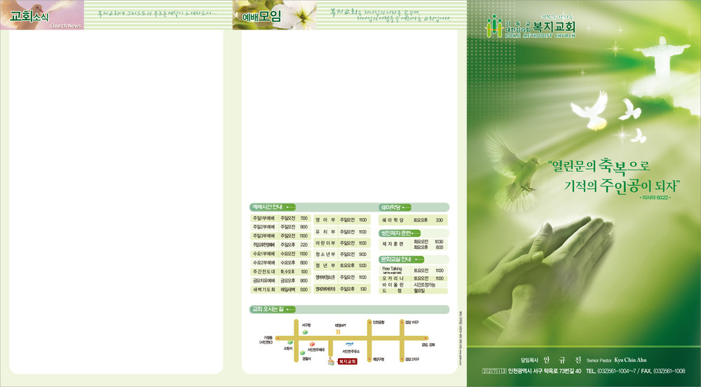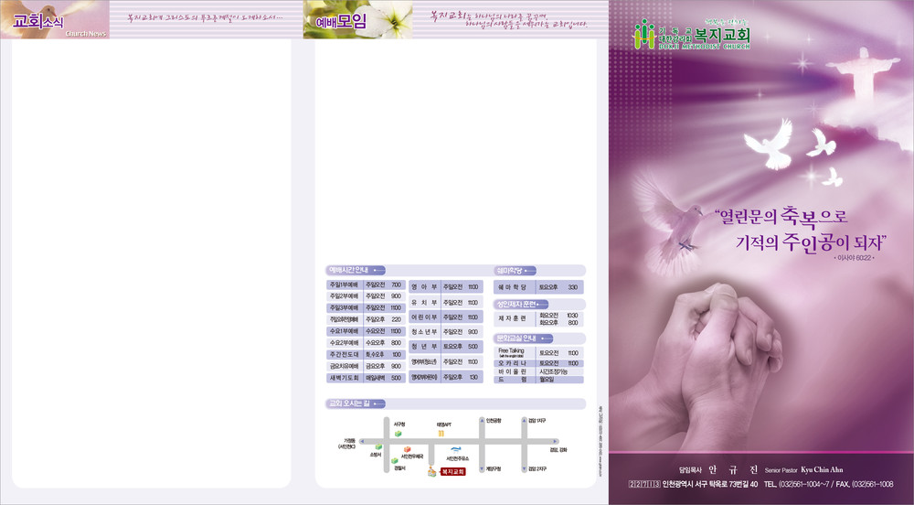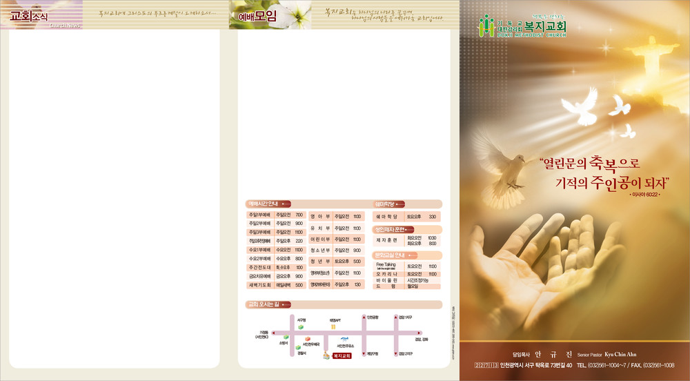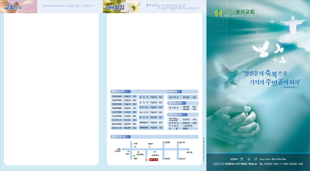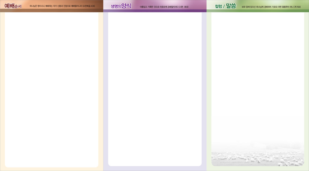 모든 디자인이 완료된 후 현재 교회가 사용중인 한글파일을 보내주시면, 새로운 주보에 맞추어 인쇄가 가능하도록 한글파일을 제작해드리고 있습니다. (한글작업 요청시 약 1-3일 정도의 시간이 소요되오니 참고해 주시기 바랍니다.)