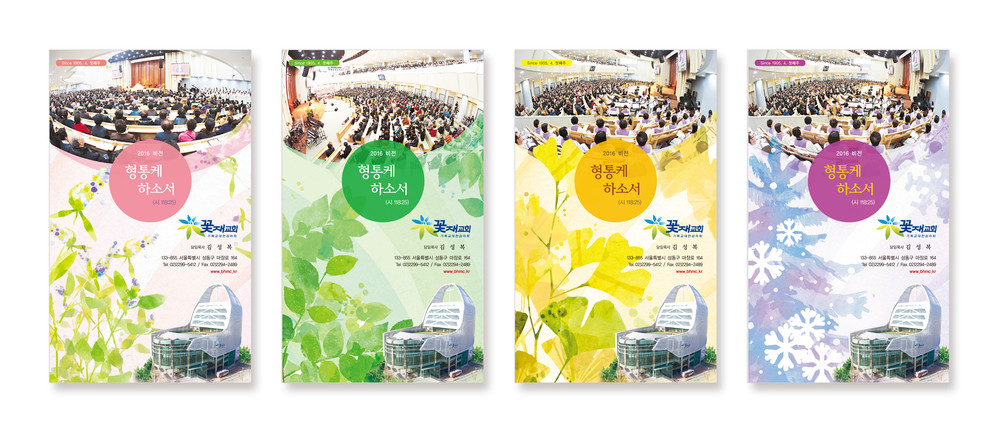보통 교정을 컴퓨터 모니터나, 칼라 프린터로 출력해서 보시는 경우 모니터(빛의 색 RGB)와 인쇄물(잉크색 CMYK)에는 약간의 차이가 있습니다. 각 교회에서 사용되는 칼라 프린트도 옵셋 인쇄와는 인쇄 방식이 조금 달라 색상의 차이가 있습니다. 특히 종이의 재질(모조지, 아트지, 고급용지)에 의한 색의 차이도 발생할 수 있습니다.