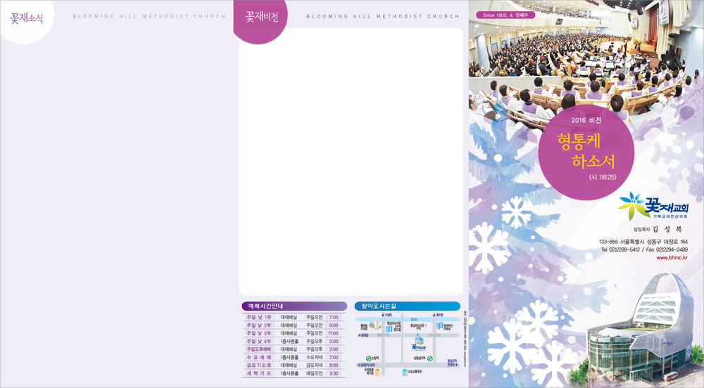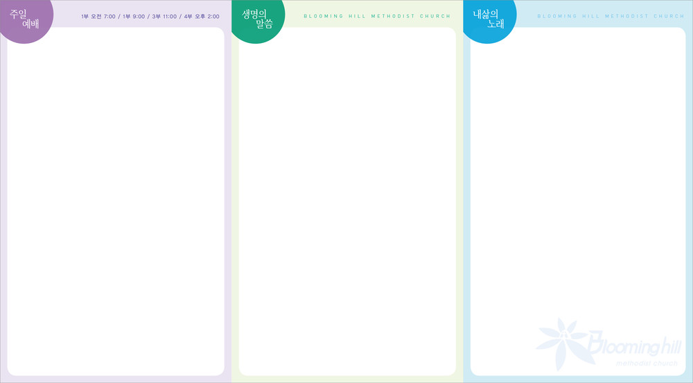 모든 디자인이 완료된 후 현재 교회가 사용중인 한글파일을 보내주시면, 새로운 주보에 맞추어 인쇄가 가능하도록 한글파일을 제작해드리고 있습니다. (한글작업 요청시 약 1-3일 정도의 시간이 소요되오니 참고해 주시기 바랍니다.)